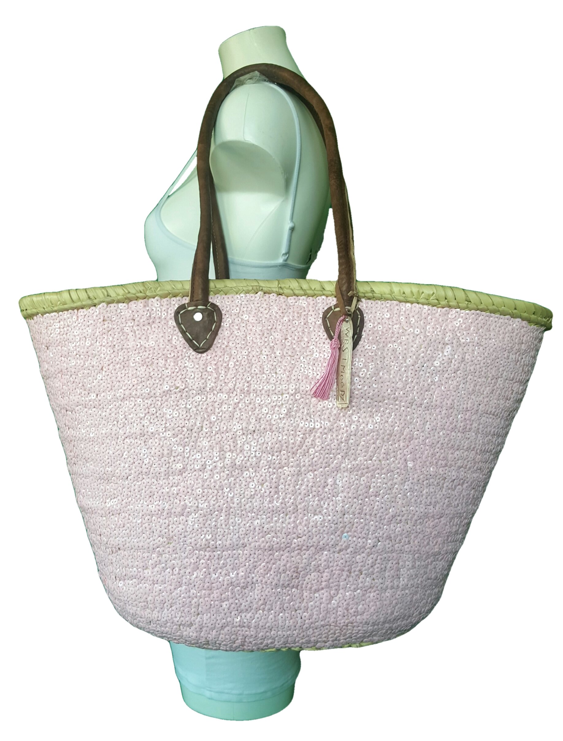 Super gave rieten strandtas met dichte rietrand en roze pailletten.