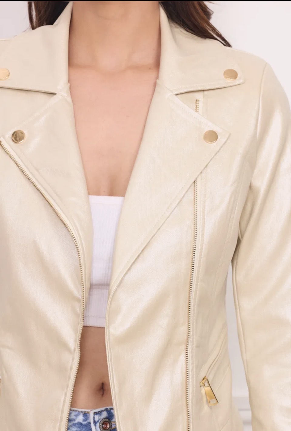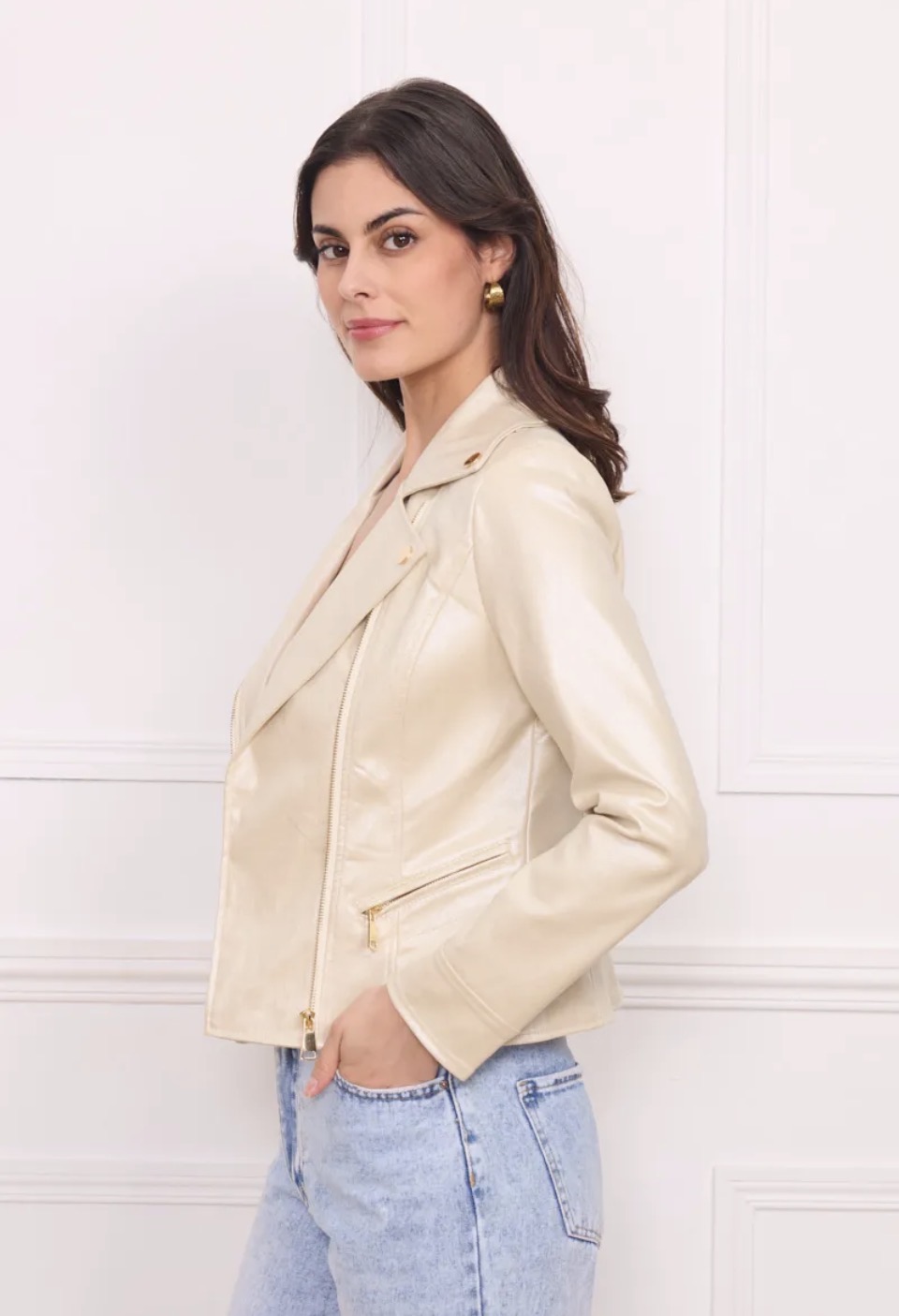 – **Details:** Voorzien van goudkleurige ritssluitingen en knopen die een moderne twist geven aan het klassieke bikerdesign.