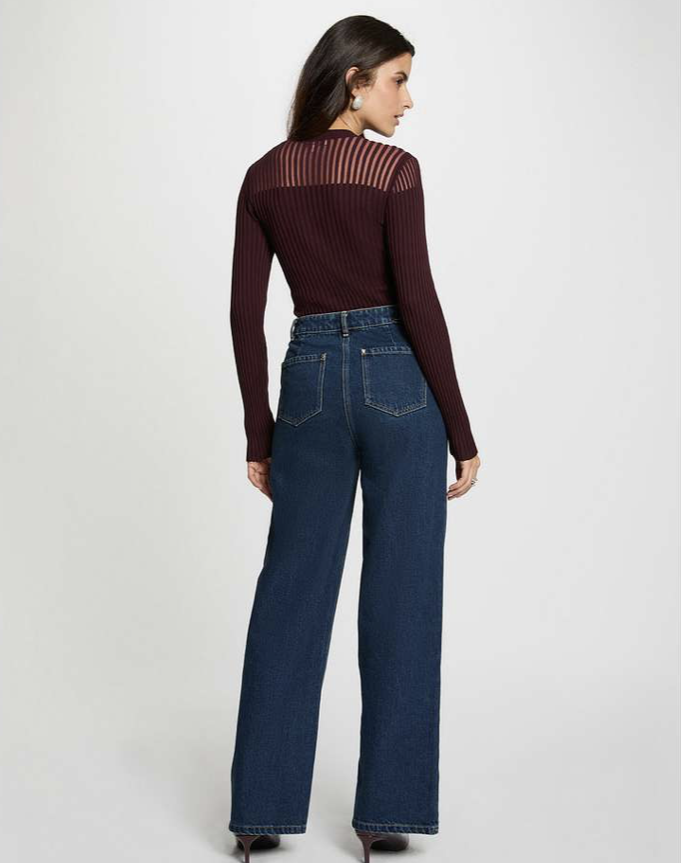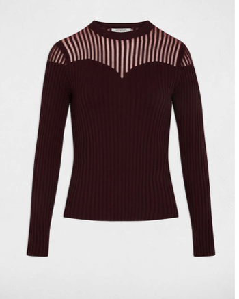 Truitje burgundy halslijn gaas Dit leuke truitje heeft dikke ribbels in een mooie strech kwaliteit waardoor deze soepel valt, en mooi afkleed een lage halslijn die in ingezet in een combinatie van gaas met dezelfde ribbels in de stof.